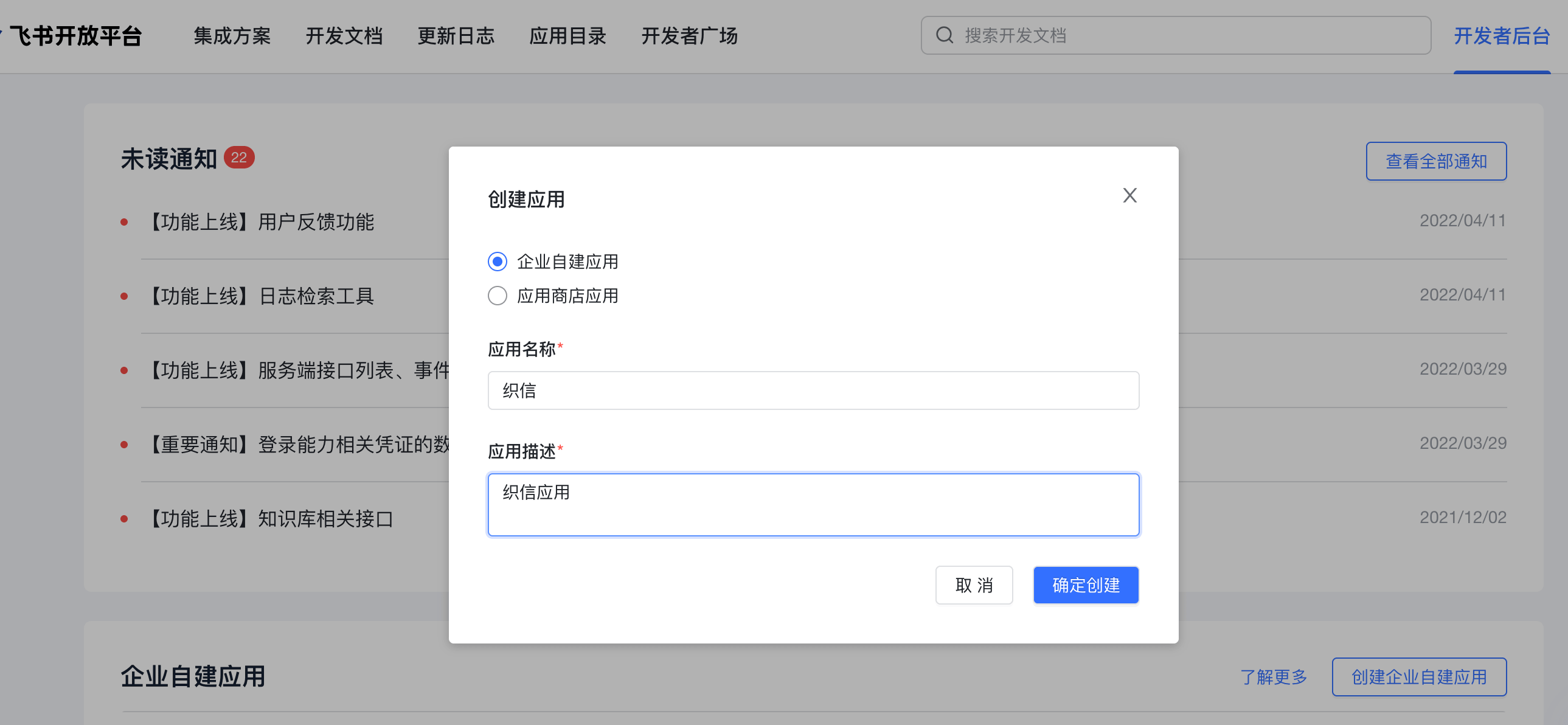 创建完团队后,需要进入 飞书开放平台 创建一个企业自建应用。