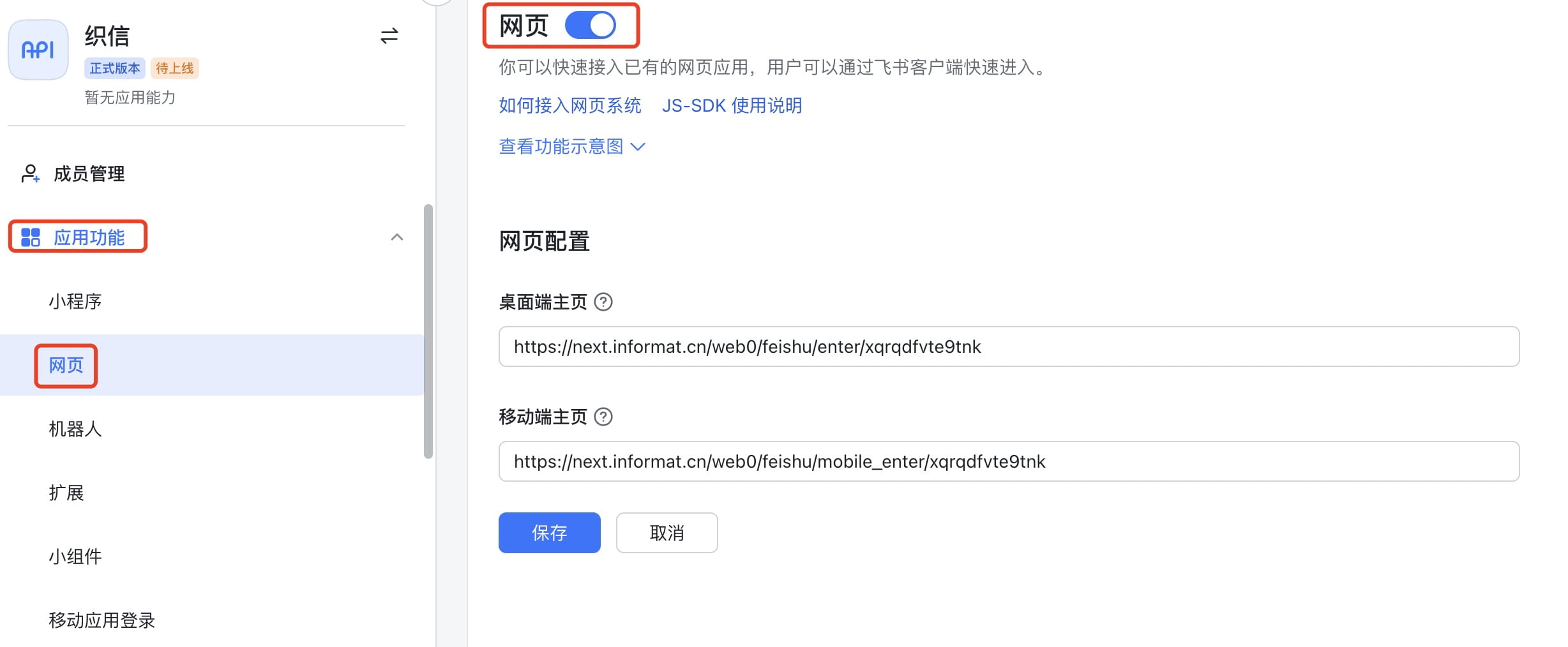 选择「应用功能 >> 网页」,启用网页,设置桌面端和移动端主页后,点击「保存」。