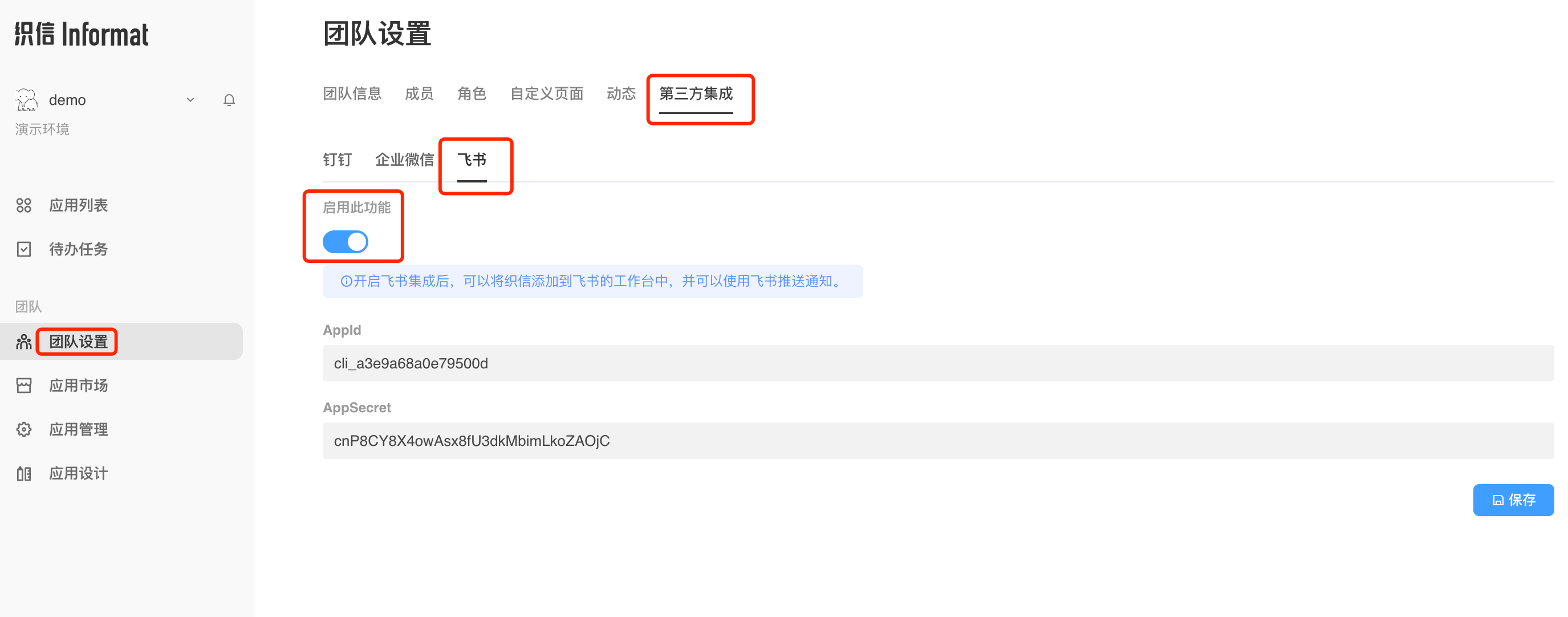 在织信工作台「团队 >> 团队设置」下,找到「第三方集成」,选择「飞书」,点击「启用此功能」,填入第2步保存的飞书AppID 和 App Secret后点击「保存」。
