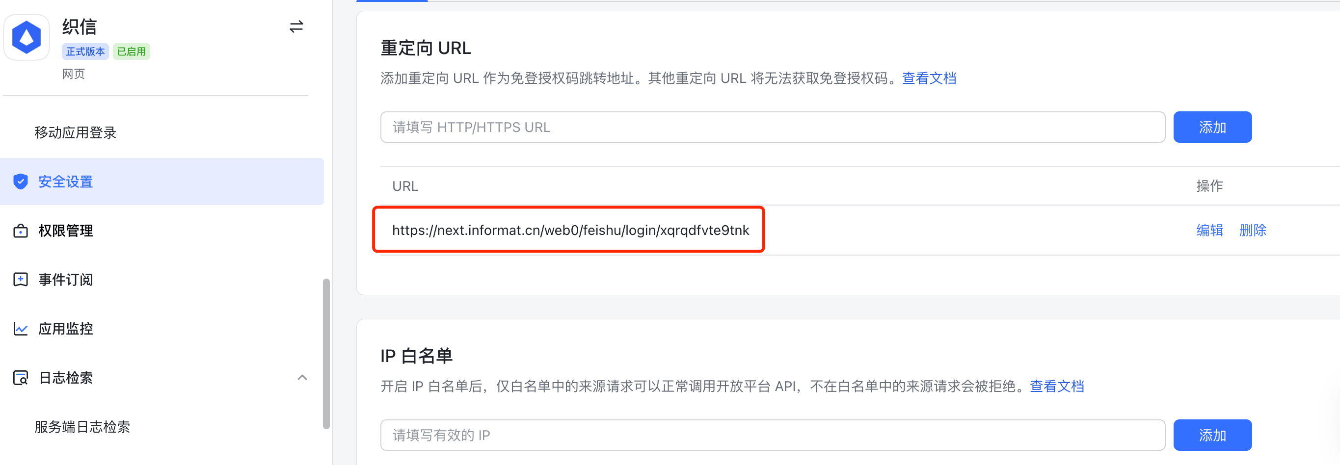 在「安全设置」中的「重定向 URL」中添加:https://next.informat.cn/web0/feishu/login/{团队ID} URL最后一个参数是上一步获取的团队ID
