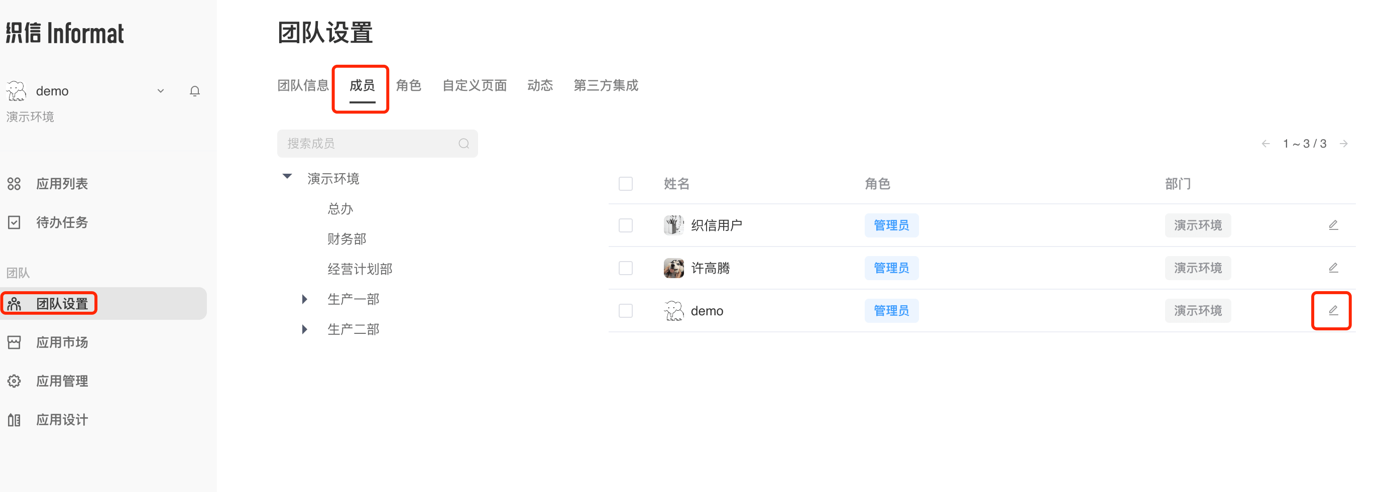 - 8.1 在织信工作台「团队 >> 团队设置」下,找到「成员」,点击「编辑」按钮,打开成员编辑页面。