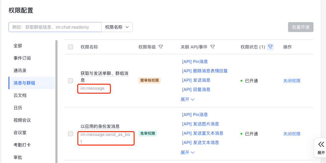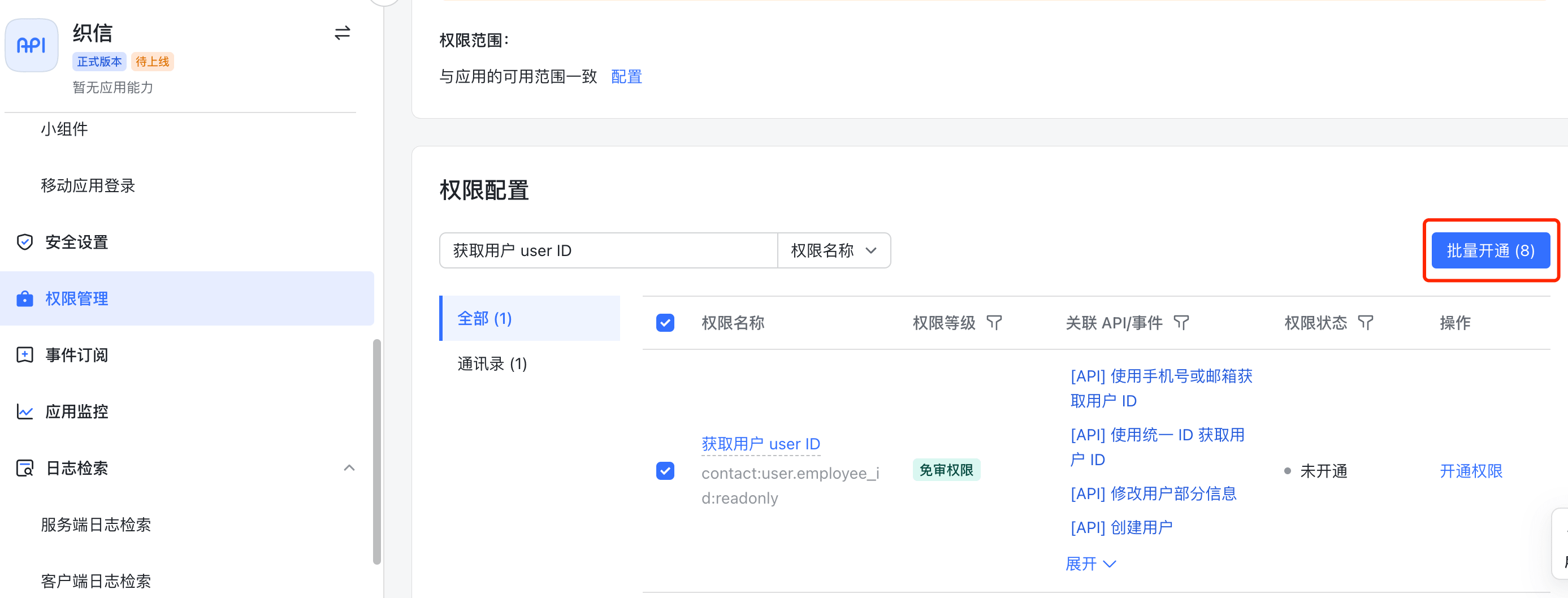 在「权限管理」中,将以下需要设置的权限一一选择,然后点击「批量开通」。如下图所示: