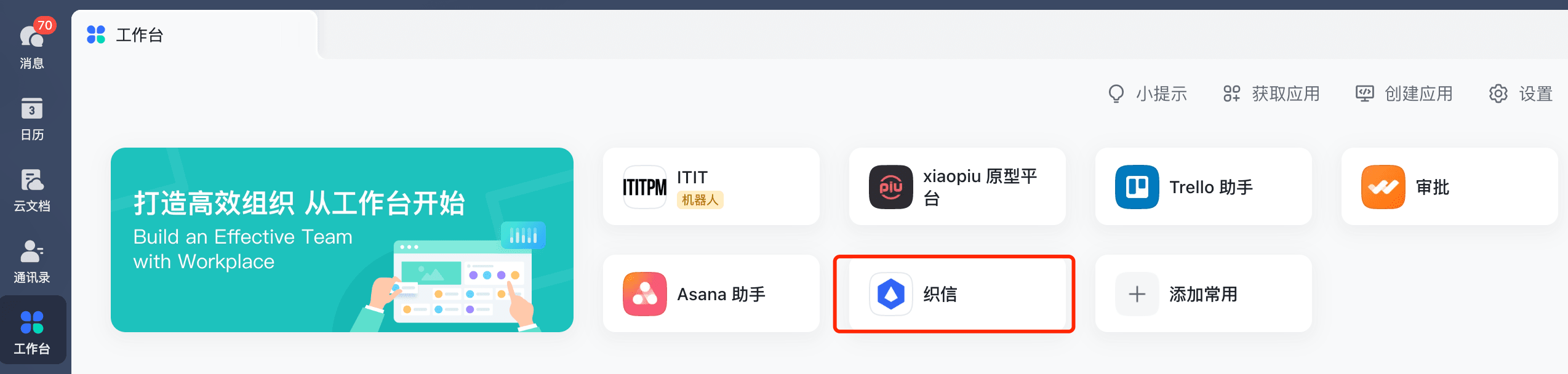 织信支持与飞书进行集成,通过飞书自建应用并完成相关配置,即可在飞书工作台使用织信。