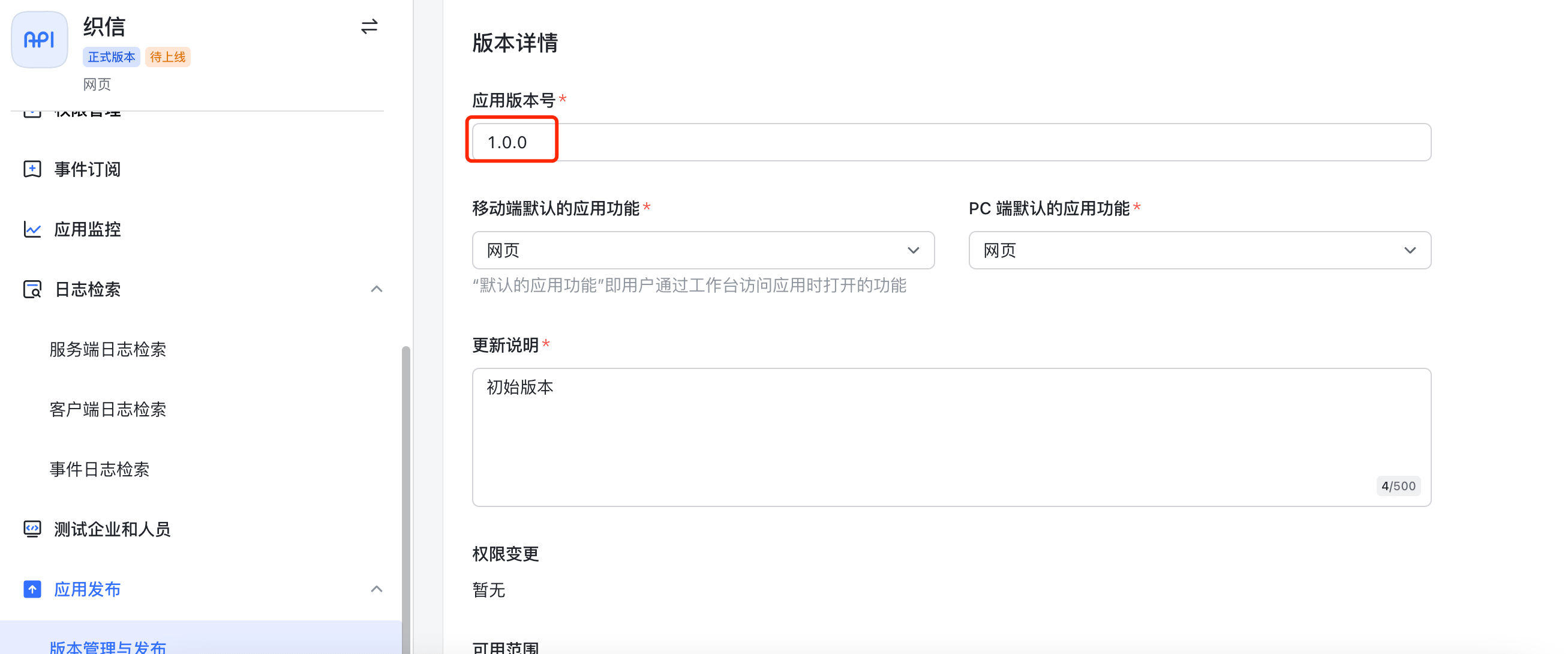 版本详情页面如下填写: 应用版本号: 1.0.0 更新说明: 初始版本 点击「保存」