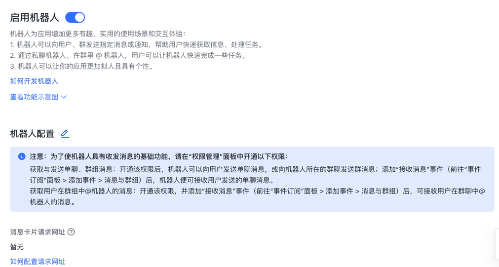 在飞书开放平台,打开自建应用页面。找到「应用功能>> 机器人」,点击「启用机器人」