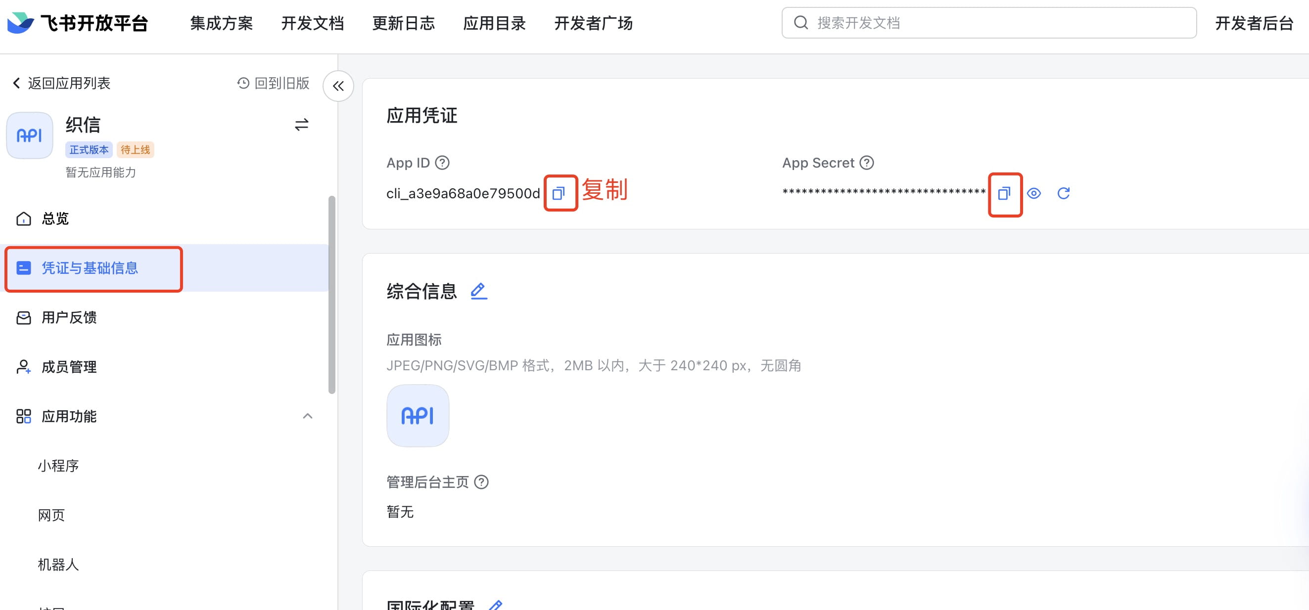 点击刚创建的应用,在「凭证与基础信息」中,将参数 AppID 和 App Secret 记录下来。