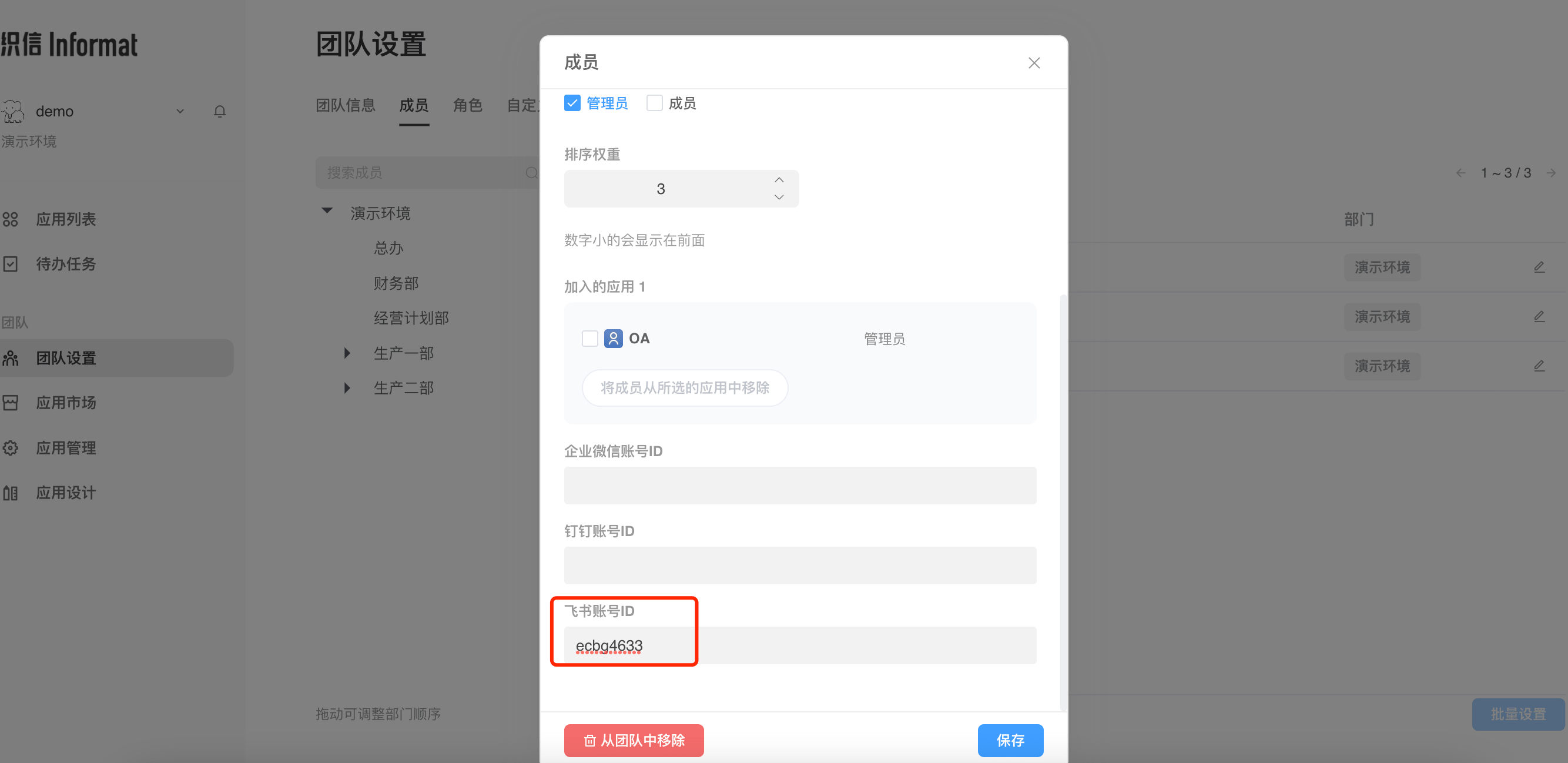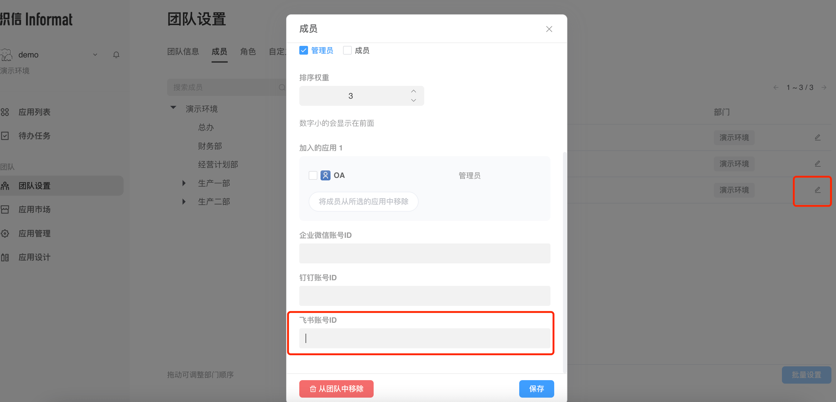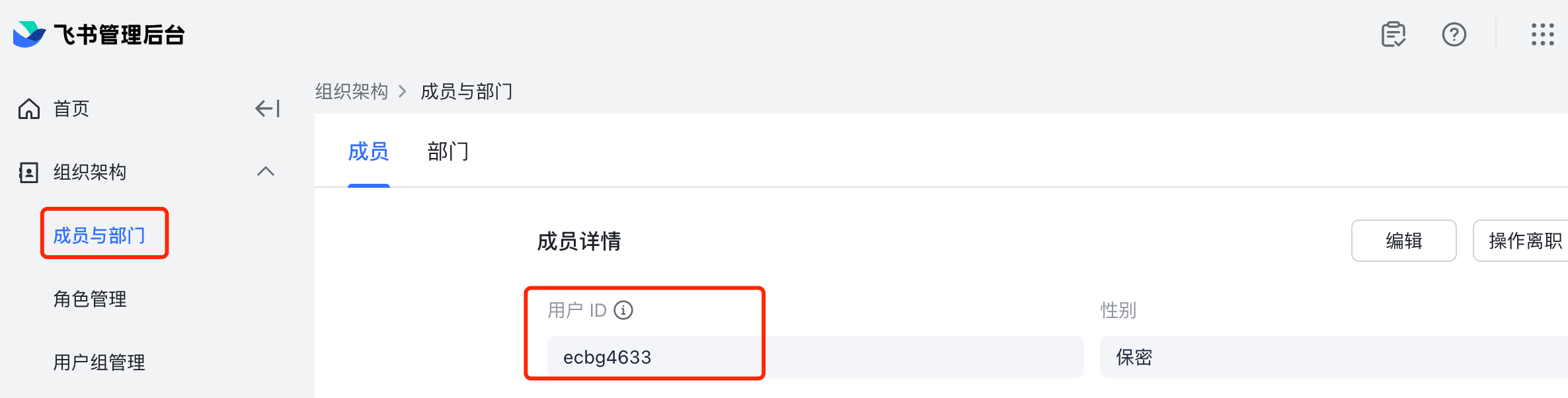 - 8.3 在8.1打开的编辑成员页面里,「飞书账号ID」,填入8.2得到的飞书用户ID,并保存
